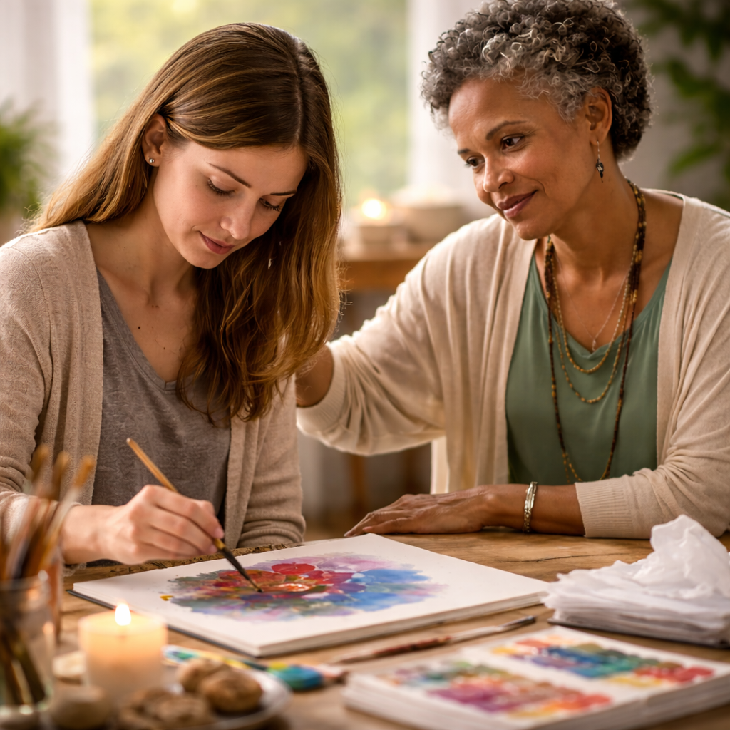 Art therapy supports individuals navigating change by helping them visually explore identity, values, and personal narratives. Creative expression brings clarity during transitions such as career changes, relationship shifts, or personal reinvention.