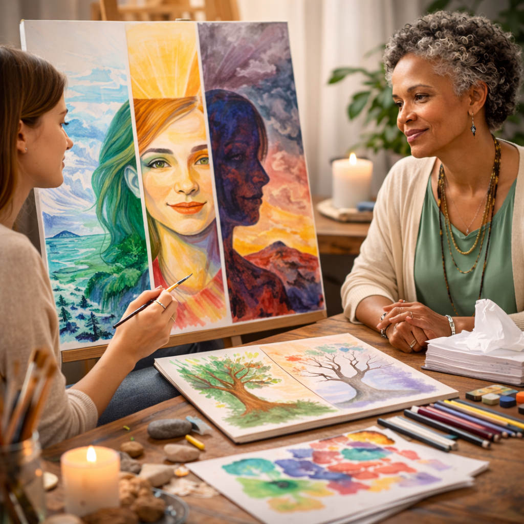 Art therapy supports individuals navigating change by helping them visually explore identity, values, and personal narratives. Creative expression brings clarity during transitions such as career changes, relationship shifts, or personal reinvention.